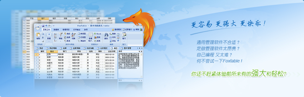 如果有人告訴你,有這樣一款軟件,不管你有沒有基礎,只需一周左右的時間就能讓你成為一個數據管理高手,而且其數據錄入之快捷、統計查詢之強大、報表輸出之多樣,目前市面上的軟件無出其右;同時只要你愿意,它可以立即變身為一個開發(fā)平臺,而且從PC到手機、從C/S到B/S、從客戶端到服務端、從單機到局域網再到互聯網、從常規(guī)的數據管理到文檔管理、從單業(yè)務管理系統到企業(yè)整套ERP,包括企業(yè)IM,它都能勝任開發(fā),并且可以編譯成獨立的可執(zhí)行文件。它不僅簡單,而且高效,高效到一人可抵一個小團隊;它能讓一個完全沒有接觸過編程的職場菜鳥,在3個月甚至更短的時間內蛻變?yōu)橐粋€管理軟件開發(fā)的全棧工程師。你可能不會相信,真的有這樣的軟件嗎?有,就是Foxtable!Foxtable將Excel、Access、Foxpro、VB以及易表的優(yōu)勢融合在一起,無論是數據錄入、查詢、統計,還是報表生成,都前所未有的強大和易用,普通用戶無需編寫任何代碼,即可輕松完成復雜的數據管理工作,真正做到拿來即用。同時Foxtable又是一個高效開發(fā)工具,專門針對數據管理軟件的開發(fā)作了大量的優(yōu)化,使得用戶在開發(fā)過程中只需關注商業(yè)邏輯, 無需糾纏于具體功能的實現,這樣Foxtable不僅開發(fā)效率十倍于其他專業(yè)開發(fā)工具,而且更加易用,幾乎人人都能掌握。讓普通人開發(fā)出專業(yè)水準的管理軟件,以前是一個不可思議的想法,而Foxtable的出現,讓這成為現實。而且Foxtable內置了HTTP服務和手機網頁生成功能,用戶不需要任何專業(yè)知識,甚至可以完全不懂網頁設計,也能快速開發(fā)出手機端的管理軟件。此外,Foxtable不僅內建數據庫,還支持Access、SQL Server、Oracle等主流數據庫作為外部數據源,并提供了數據動態(tài)加載、后臺統計等功能,使得相距千里的不同電腦協同處理數據,以及海量數據管理,非專業(yè)人士也能輕松應付,從而讓普通人也能快速開發(fā)出各種基于互聯網的管理系統,如進銷存、MRP、ERP、OA、CRM、SCM、MIS系統等等。不僅如此,FoxTable還同時具備B/S和C/S架構的優(yōu)勢,可以像B/S軟件一樣易于部署,同時又具備C/S軟件良好的用戶體驗和交互性。經過十年的發(fā)展,目前國內已經有數萬企事業(yè)單位成功利用Foxtable自行開發(fā)管理系統,不再受制于軟件公司,不少單位節(jié)省了以十萬甚至百萬計算的費用;同時也發(fā)展了一大批個人愛好者,這些愛好者很多都是企業(yè)管理人員,熟悉管理和業(yè)務邏輯,以前苦于沒有合適的開發(fā)工具,無法根據自己的需要自行開發(fā)系統,Foxtable的出現,讓他們如虎添翼,紛紛開發(fā)出適合自己企業(yè)的管理軟件,讓領導和同事刮目相看,大大提高了自己在職場的競爭實力,一些用戶因此改變了自己的職業(yè)生涯甚至人生。 [ + 展開 ]